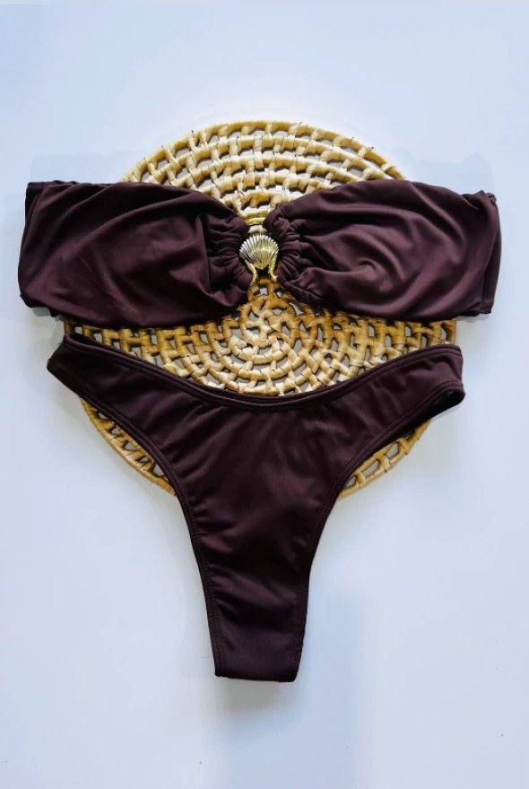O top tomara que caia é o destaque principal: seu design sem alças valoriza o colo e garante um bronzeado uniforme, enquanto a argola central com detalhe de concha traz um charme exclusivo e um toque praiano irresistível. Essa aplicação especial remete ao frescor das praias paradisíacas e ao brilho natural das conchas, transformando o look em algo único e memorável.